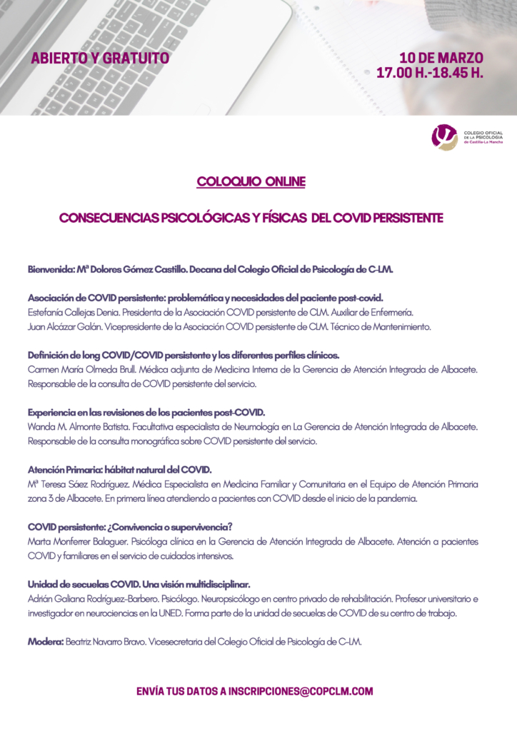 Dentro de las actividades programadas en el Plan de Formación 2021-2022 del Colegio Oficial de la Psicología de Castilla-La Mancha, el jueves 10 de marzo de 2022, a las 17:00 horas, tendrá lugar el Coloquio de Psicología “Consecuencias Psicológicas y Físicas del Covid Persistente”
