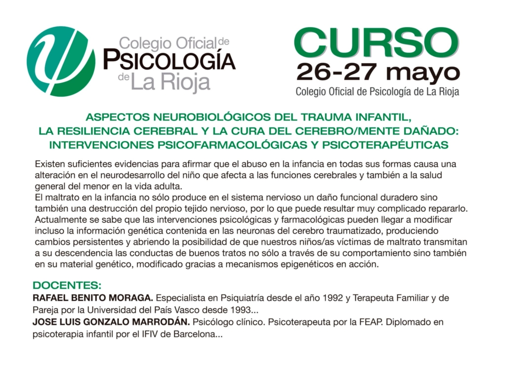Los días 26 y 27 de mayo de 2023, el Colegio Oficial de la Psicología de La Rioja organiza el curso “Aspectos Neurobiológicos del Trauma Infantil COP La Rioja”