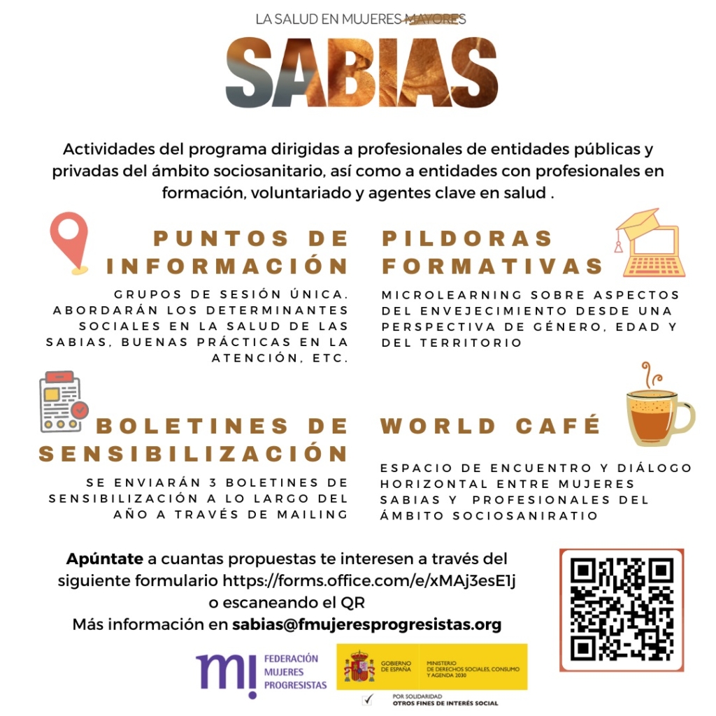 En 2024, la Federación de Mujeres Progresistas quiere compartir todo lo aprendido con los y las profesionales, futuros profesionales y personal voluntario, que las atienden, para entre todos y todas ir mejorando la salud de las SABIAS con una visión más completa y ajustada a su realidad.