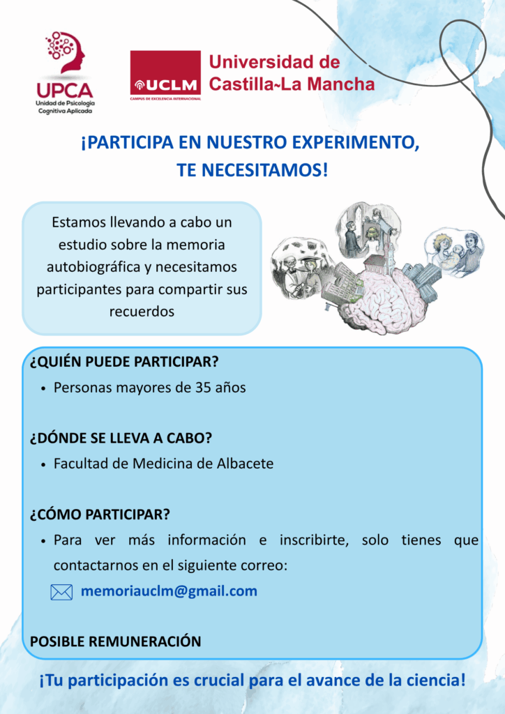 Durante las sesiones, los participantes realizarán tareas relacionadas con la evocación y valoración de recuerdos autobiográficos, junto con otras pruebas complementarias. Como agradecimiento por su colaboración, podrán ofrecer una pequeña remuneración económica a los participantes.
