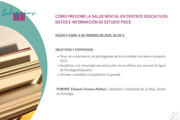 Dentro de las actividades programadas en el Plan de Formación 2025-2026 del Colegio Oficial de Psicología de Castilla-La Mancha, el jueves 5 de febrero, a las 18:00 horas, tendrá lugar el coloquio on line “Cómo prevenir la salud mental en centros educativos. Datos e información de estudio PSICE”.