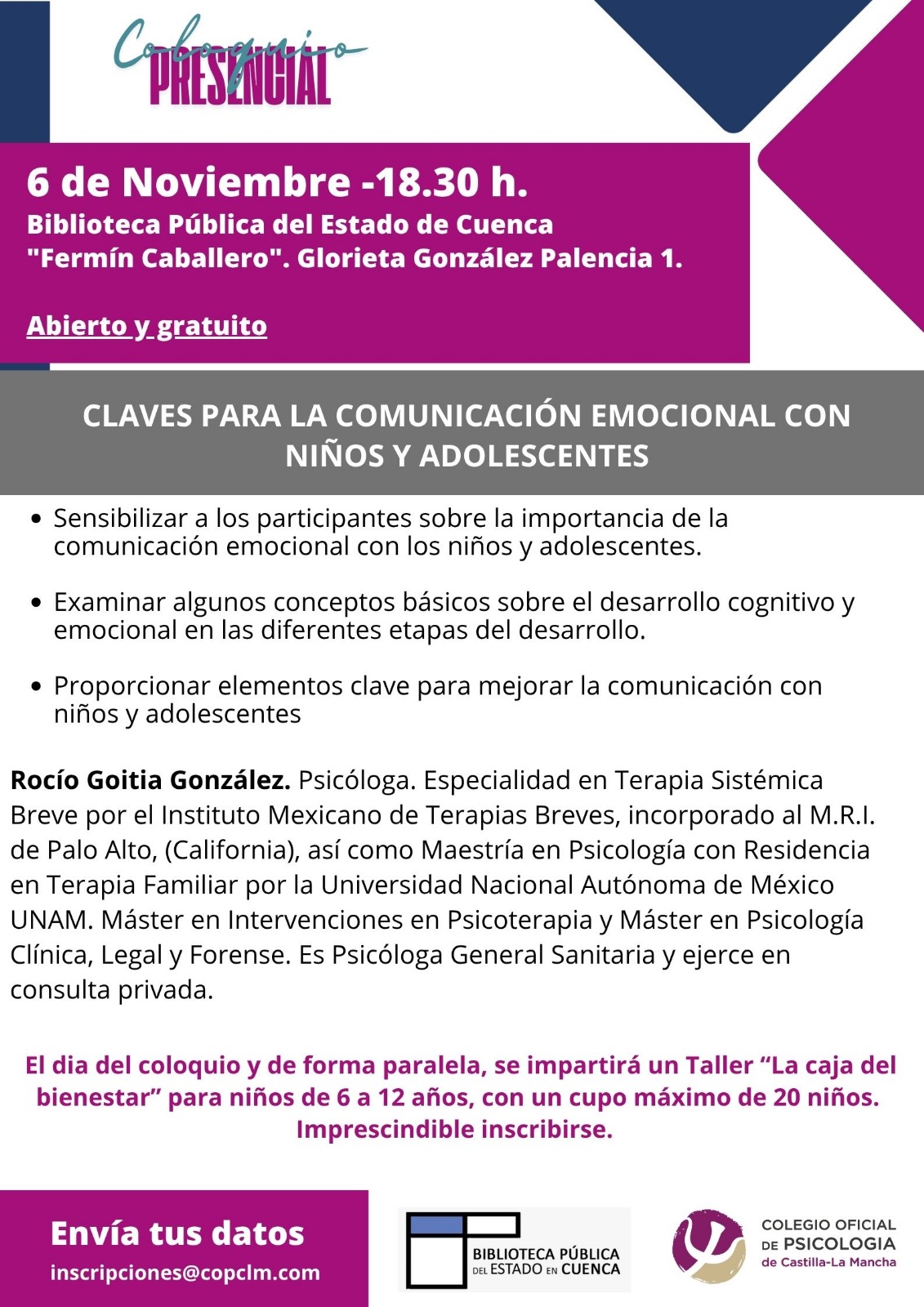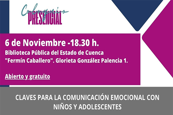Dentro de las actividades programadas en el Plan de Formación 2025-2026 del Colegio Oficial de Psicología de Castilla-La Mancha, el jueves 6 de noviembre, a las 18:30 horas, tendrá lugar el coloquio on line denominado ” Claves para la comunicación emocional con niños y adolescentes”, en la Biblioteca Pública del Estado “Fermín, Caballero”, en Cuenca.