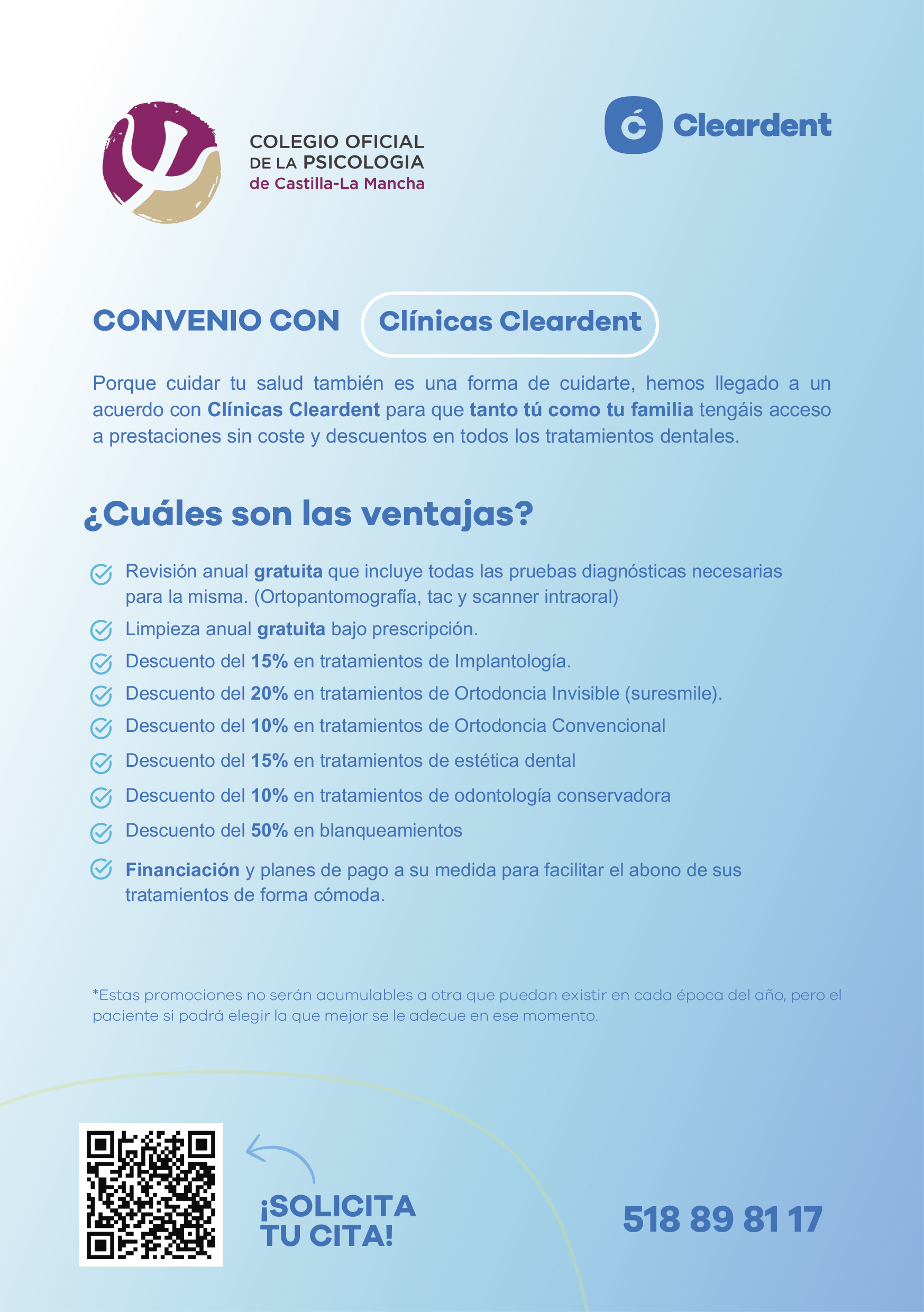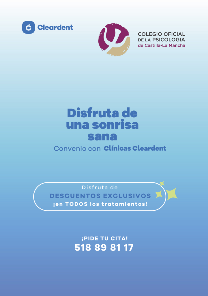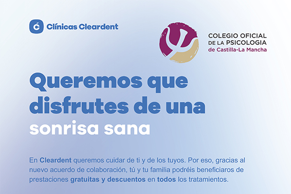 Nos complace enormemente anunciar que el Colegio Oficial de Psicología de Castilla-La Mancha ha firmado un acuerdo de colaboración con Clínicas Cleardent, lo que significa que ahora tanto tú como tus familiares directos podréis disfrutar de una serie de beneficios exclusivos en TODOS vuestros tratamientos dentales.