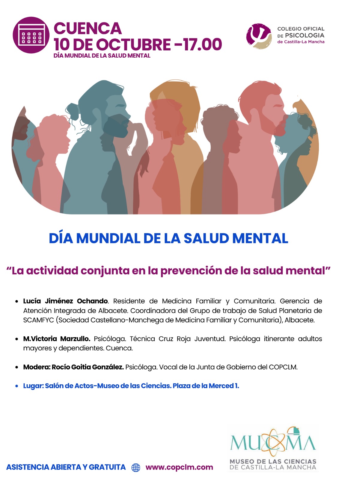 Enmarcada en las actividades organizadas por el COPCLM con motivo del Día Mundial de la Salud Mental, el Salón de Actos del Museo de las Ciencias de Cuenca (Plaza de la Merced Nº1), acoge hoy la conferencia “La actividad conjunta en la prevención de la Salud Mental”