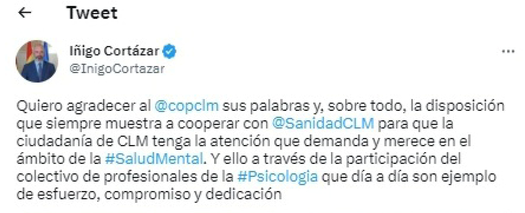 El Director General de Recursos Humanos del Servicio de Salud de Castilla-La Mancha (SESCAM), Íñigo Cortázar Neira, publicaba, el pasado 21 de abril, un agradecimiento al Colegio Oficial de la Psicología de Castilla-La Mancha a través de la red social Twitter.