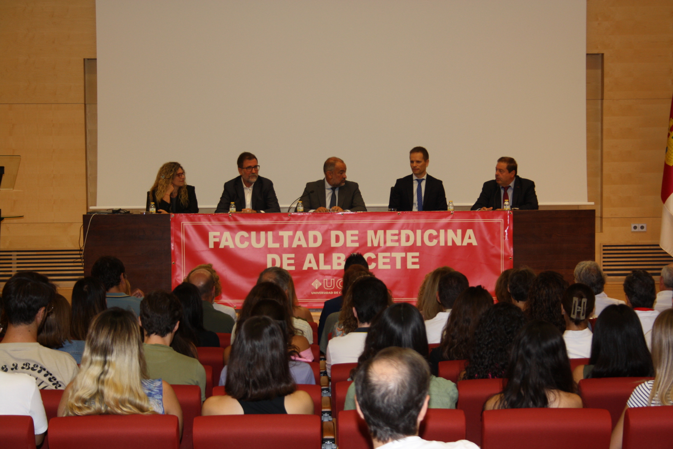 El rector de la Universidad de Castilla-La Mancha, Julián Garde, daba la bienvenida al estudiantado que comienza el primer curso del Grado en Psicología, acompañado del director general de Asistencia Sanitaria del SESCAM, Ibrahim Hernández; el director general de Universidades, Investigación e Innovación, Ricardo Cuevas; la decana de la Facultad de Medicina de Albacete, Silvia Llorens; y el vicedecano de la Facultad y coordinador del Grado en Psicología, José Miguel Latorre.
