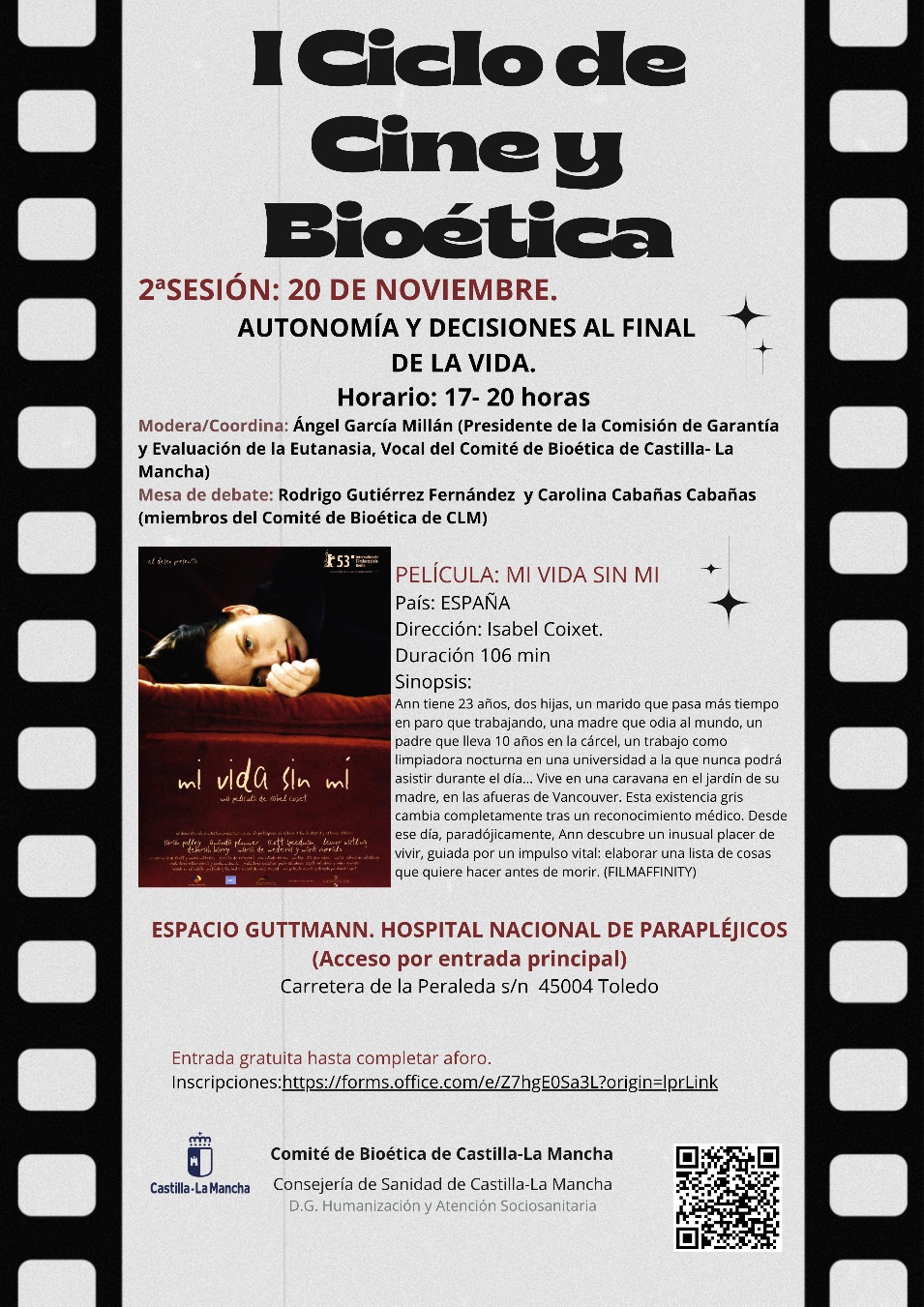 La película para proyección y debate es “Mi vida sin mí” de Isabel Coixet. En el debate se explorarán temas sobre autonomía y decisiones al final de la vida.