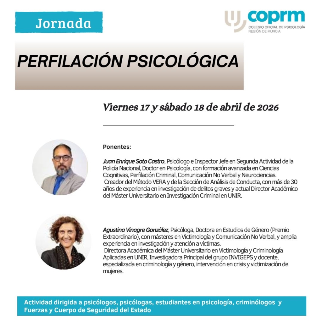El Colegio Oficial de Psicología de la Región de Murcia, ha programado una formación especializada diseñada para profesionales y estudiantes interesados en la investigación criminal desde la perspectiva psicológica, consistente en una jornada que lleva por título “Perfilación Psicológica”