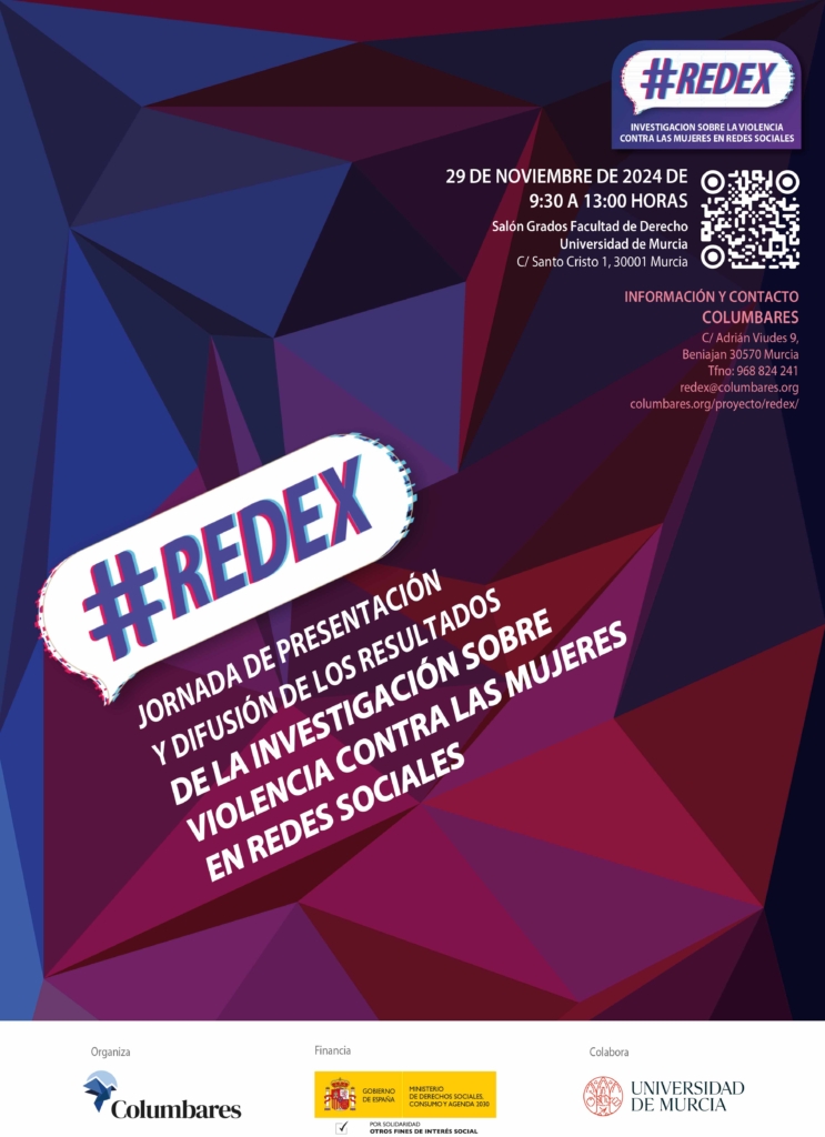 El viernes, 29 de noviembre de 2024, a las 10:00 h., en el Salón de Grados de la Facultad de Derecho de la Universidad de Murcia, y organizada por la entidad Columbares, se llevará a cabo una jornada de presentación y difusión de los resultados de la investigación sobre violencia contra las mujeres en redes sociales.