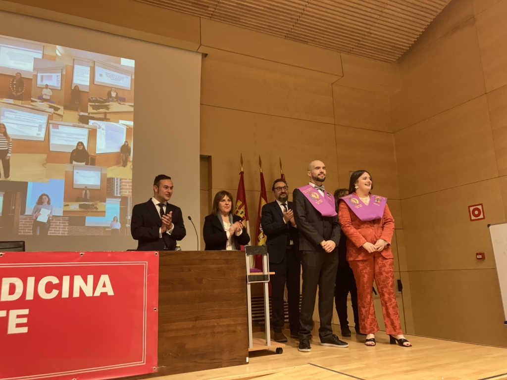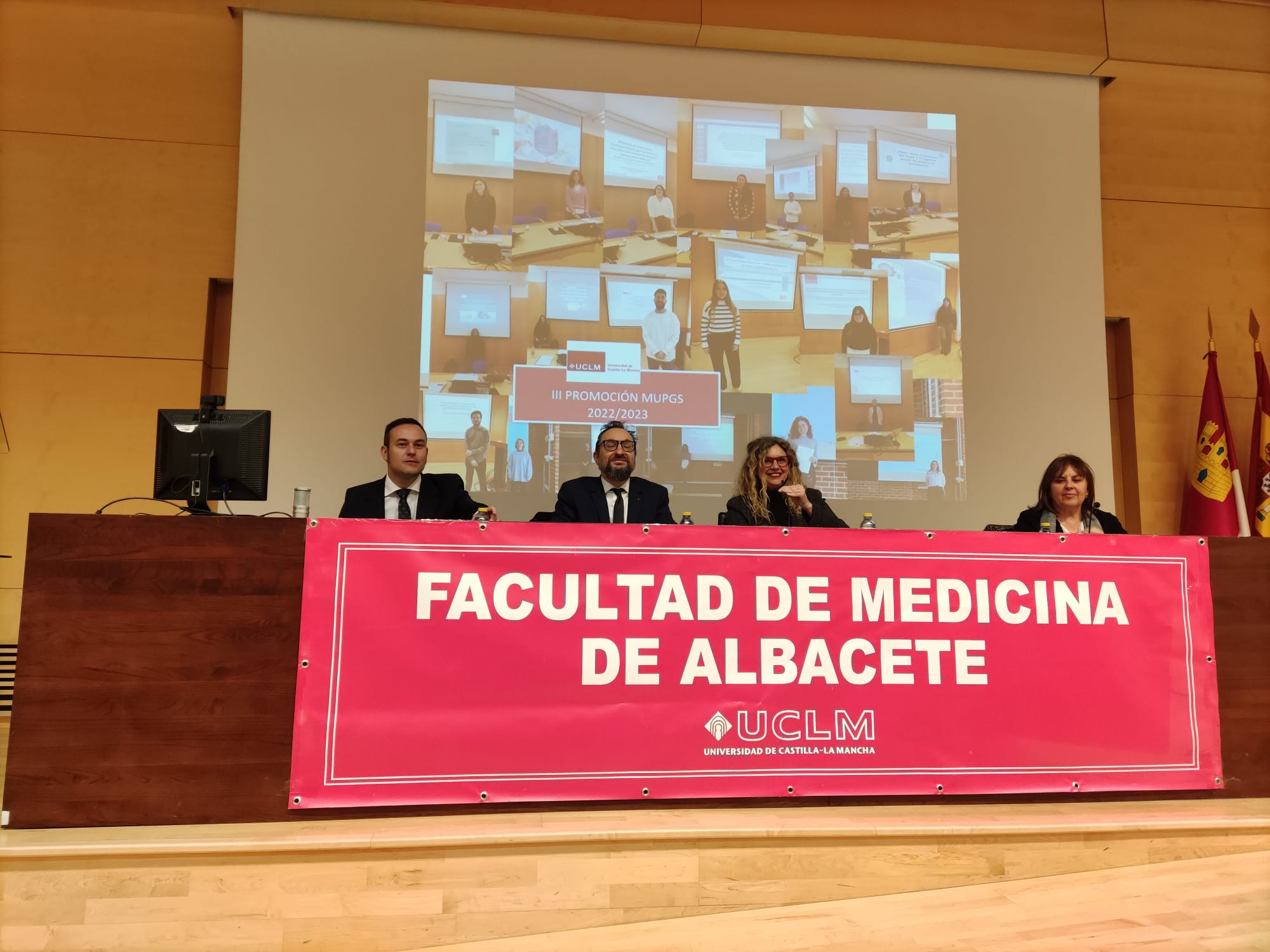 En la mesa presidencial intervinieron la decana de la Facultad de Medicina, la Dra. Silvia Llorens; el Coordinador del Máster General Sanitario y profesor, Jorge Javier Ricarte; la decana del Colegio de la Psicología de Castilla-La Mancha y profesora, María Dolores Gómez Castillo, y como padrino de la promoción intervino el profesor y psicólogo, Daniel Rama.