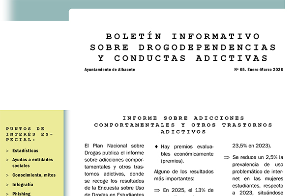 El Ayuntamiento de Albacete nos remite su Boletín Nº 65, correspondiente a los meses de enero a marzo de 2026, sobre Drogodependencias y Conductas Adictivas.