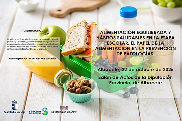 El miércoles 22 de octubre de 2025, el Salón de Actos de la Diputación Provincial de Albacete acogerá el curso denominado “Alimentación equilibrada y hábitos saludables en la etapa escolar. El papel de la alimentación en la prevención de patologías”.