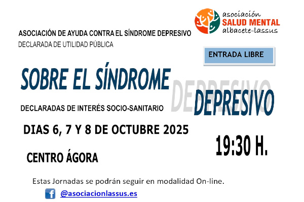 Organizadas por la Asociación Lassus, de Ayuda Contra el Síndrome Depresivo, los días 6,7 y 8 de octubre de 2025 tendrán lugar, en el Centro Ágora de Albacete, las XXIX Jornadas sobre el Síndrome Depresivo