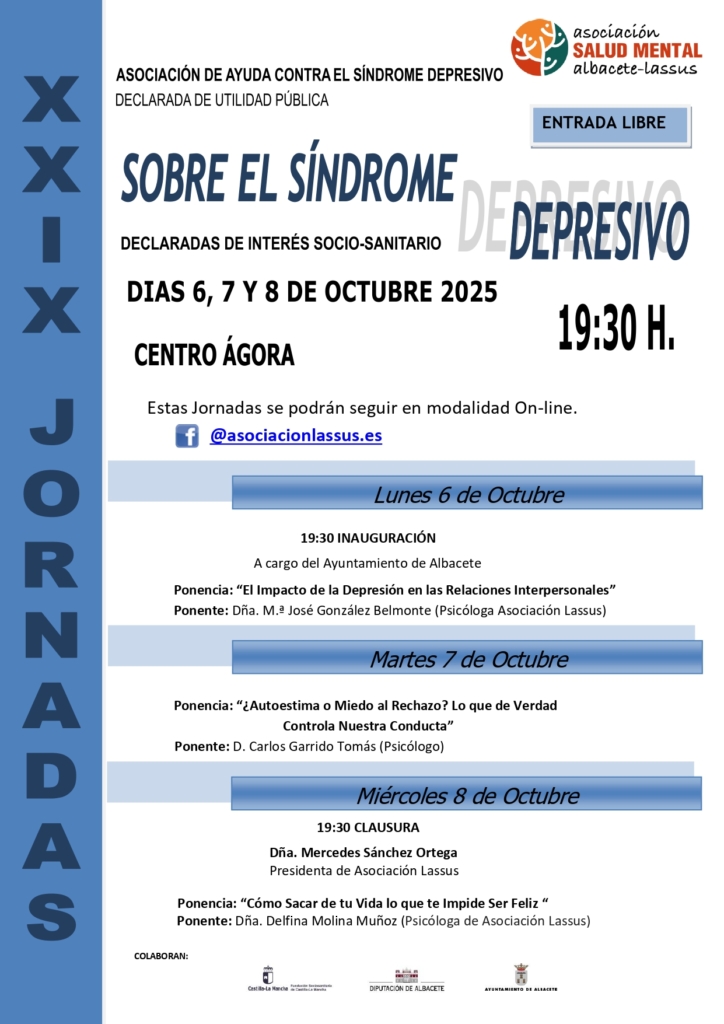 Organizadas por la Asociación Lassus, de Ayuda Contra el Síndrome Depresivo, los días 6,7 y 8 de octubre de 2025 tendrán lugar, en el Centro Ágora de Albacete, las XXIX Jornadas sobre el Síndrome Depresivo