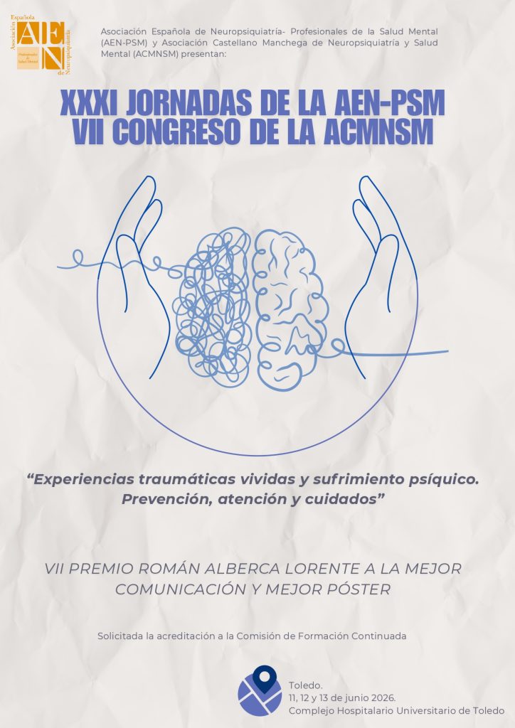 Del 11 al 13 de junio de 2026, el Complejo Hospitalario Universitario de Toledo acogerá la celebración de las XXXI Jornadas de la AEN-PSM, y del VII Congreso de la ACMNSM “Experiencias traumáticas vividas y sufrimiento psíquico. Prevención, atención y cuidados”
